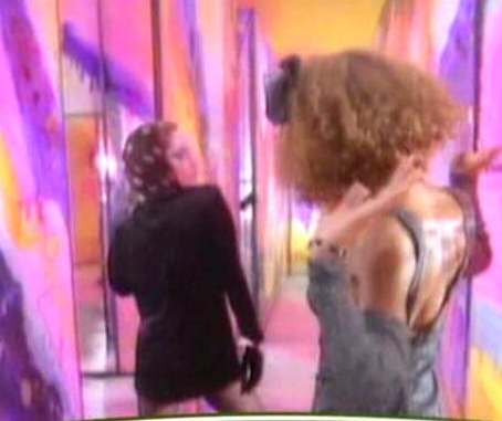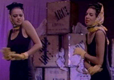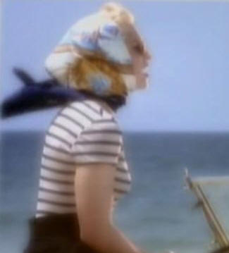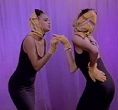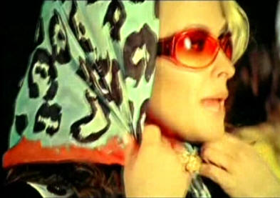 You can't get more fashion victim than the dancing girls in the videos, however! The two beauties wear Kelly-style headscarves through the whole video, both indoors and in a brief scene out in the open (where they also wear sunglasses).
