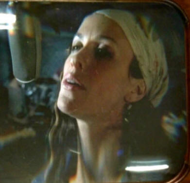 very brief scene of Alanis wearing a rear tie while doing a studio recording.