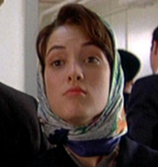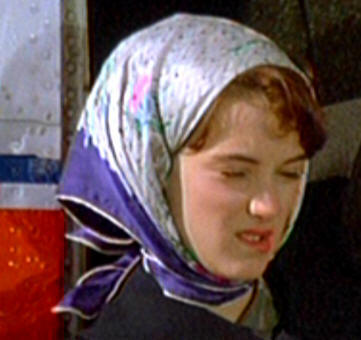Later, at Memphis Airport. It's also a Kelly head-wrap, but tied differently (of course, she wouldn't have worn it during the plane ride, even though I'd gladly pay to see 8 straight hours of Winona wearing and re-tying that scarf). It's a nice-looking tie, tight around the neck, the ends fluttering, pulled slightly forward with the scarf rolled back at the cheeks, and the tail end almost free.