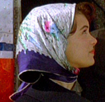 Check out Winona's headscarf: it's a Kelly, slightly loose around the neck, crossed with left end under and right end over, pulled back a little.